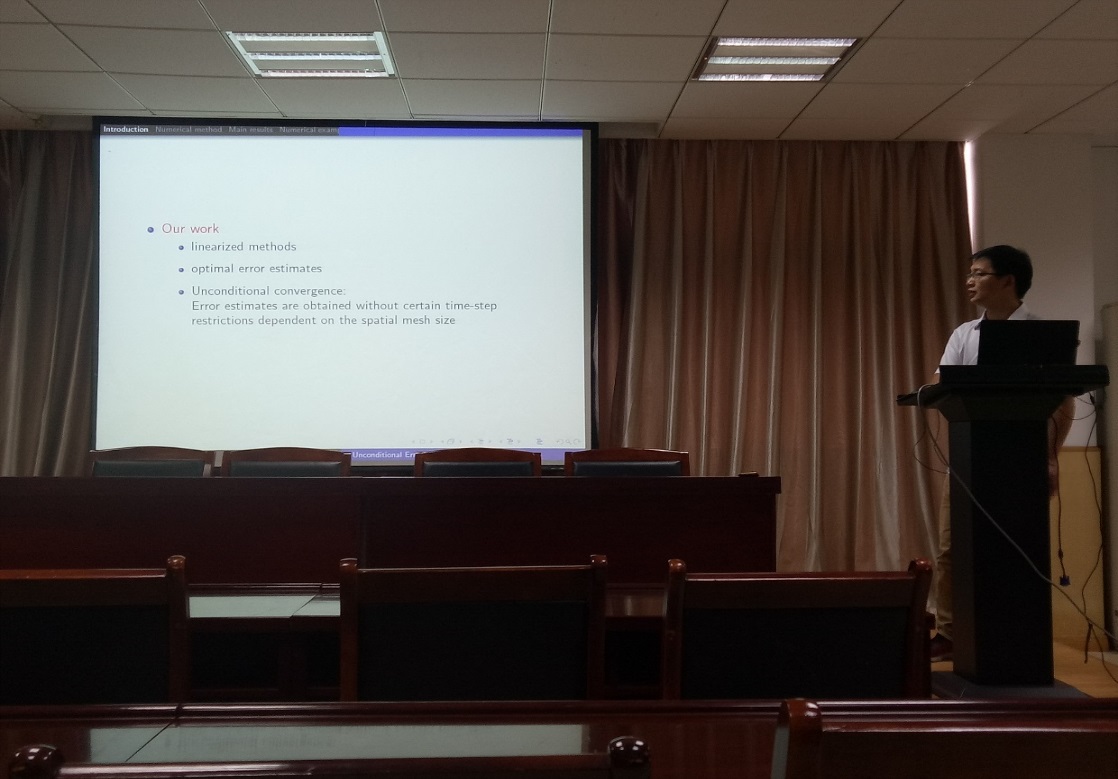 在报告中,李东方副教授通过使用离散的分数格朗沃尔不等式,无条件地得到数值概形的最优误差估计。同时,李教授也给出了若干问题,并且在报告结束后与师生展开了讨论,解答了师生的很多问题。
