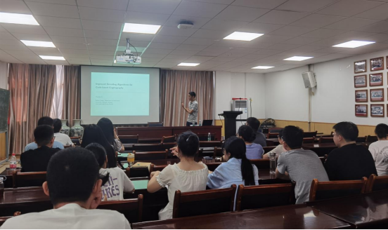 在《Improved Decoding Algorithms for Code-based Cryptography》报告中,李春雷副教授指出基于编码的密码学是后量子密码学的一个主要课题,研究LRPC码的解码是很有意义的,并详细阐述了LRPC码的解码方法。报告结束后,李春雷副教授对师生们提出的问题给予了耐心解答,且对报告的内容进行了深入交流讨论,在场师生受益匪浅。