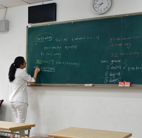 -free graphs》。胡小兰老师首先向大家介绍了报告相关的概念以及研究背景,接着向大家报告了他们团队关于fractional chromatic number的最新研究成果。胡小兰老师的讲解非常详细,思维严谨,极大鼓舞了青年教师和员工们的学术热情,给大家带来了很多启示。