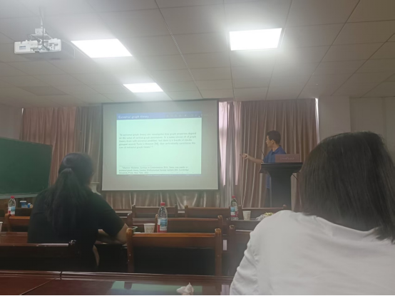 江西师范大学李红海教授的报告题目是《A signless Laplacian spectral Erdös-Stone-Simonovits theorem》。李红海教授首先向大家介绍了图的无符号Laplacian谱相关的概念以及研究背景,Erdös-Stone-Simonovits 定理相关问题的研究进展,并向大家介绍了他们团队的最新研究成果。最后,与本团队教师就图的谱极值问题进行了探讨,给接下来本团队的研究工作提供了新思路。李红海教授讲解得十分详细,思维严谨,极大鼓舞了青年教师和员工们的学术热情,给大家带来了很多启示。