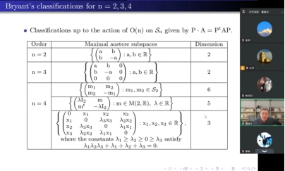 报告中,葛建全教授回顾了Austere Submanifolds和Austere Matrices的定义以及重要的性质,并详细介绍了Bryant关于极大Austere子空间在不同维数的构造,同时还通过多位数学家的工作介绍了等参理论的历史发展、基本结构和分类问题。随后他介绍了Dupin超曲面和李球面几何的内容和已有的工作,并着重介绍了他与合作者所得到的一些结果。此外,他还就Austere子空间维数的上界问题同与会师生进行了讨论。参会师生通过此次讲座,对于Austere空间、Dupin 超曲面等问题的研究专题有了一定的了解,丰富了自身的知识。