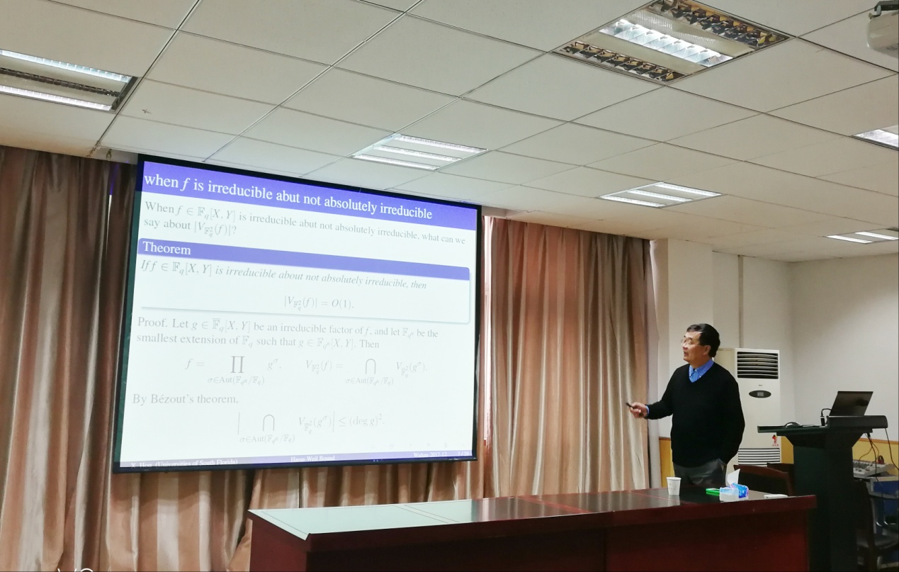 报告中,侯教授介绍了Hasse-Weil界及其在exceptional多项式、二项式置换、Button Madness 和Dickson多项式等方面应用的最新研究成果,其中重点介绍了在置换二项式方面的最新成果,利用Hasse-Weil界证明了某些置换二项式的不存在性。