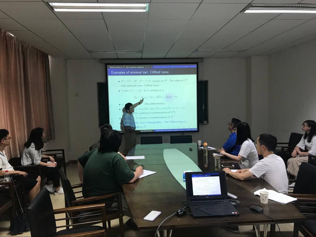 该报告考虑了Willmore stable问题,将Urbano定理推广到中的极小环。报告结束后,参加报告的师生与王鹏老师讨论了一些相关专业的问题,收益匪浅。