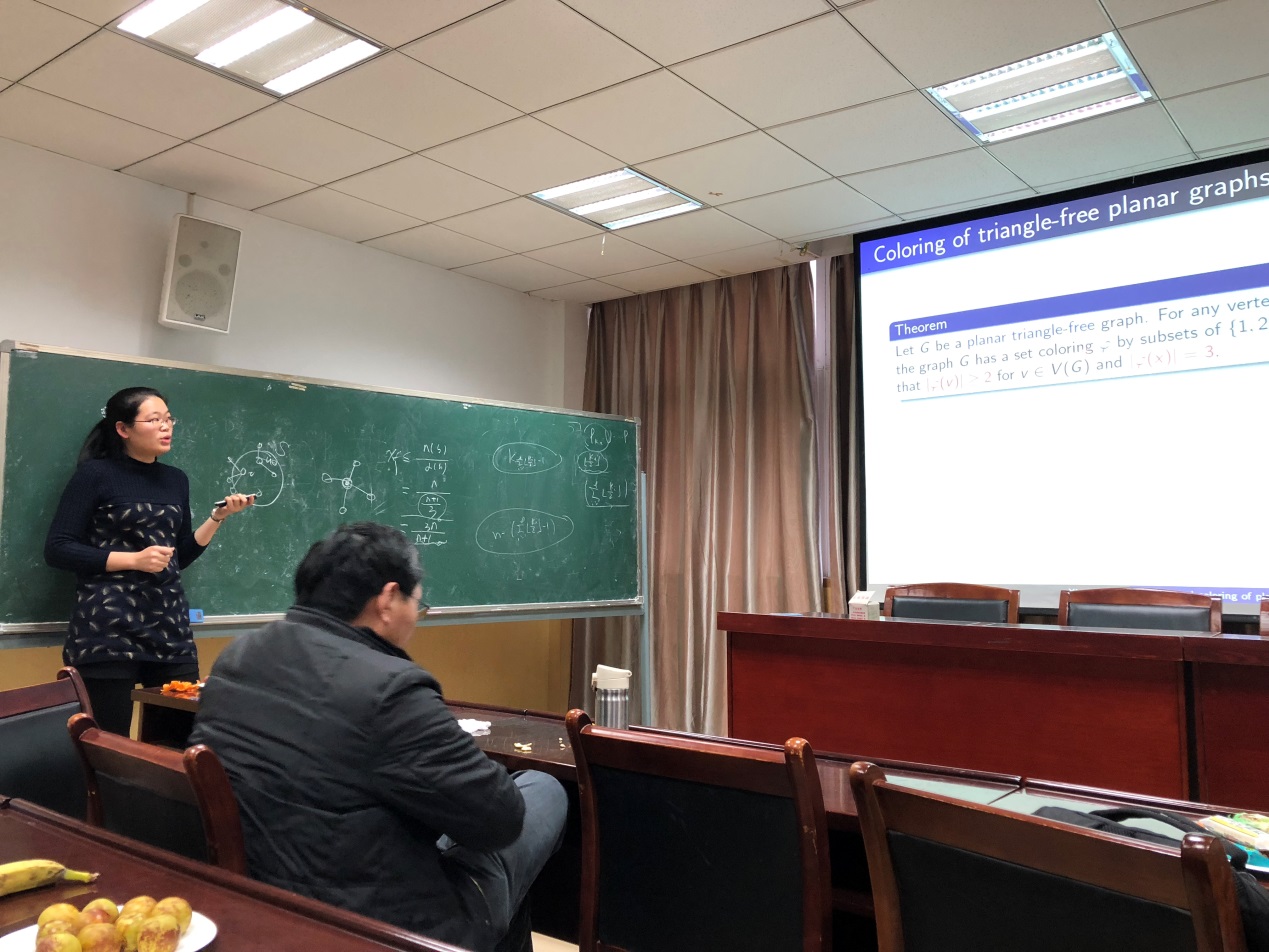 12月16日下午,华中师范大学胡小兰老师应邀来访公司,在院201报告厅为公司师生做了题为“Fractional coloring of planar graphs with given number of triangles”的学术报告,报告由刘慧清教授主持。来自运筹学与控制论专业的教师、博士和硕士研究生参加了本次学术报告。
