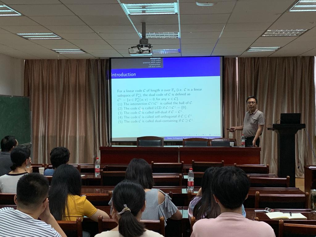 报告详细地介绍了代数编码中的一些正交问题,其中包括LCD码,量子MDS码以及自正交码中的正交问题,并且简要介绍了岳勤教授团队在这三个方面所做的工作。报告后与老师同学们展开了激烈的讨论,岳教授的报告思路清晰,内容丰富,让大家受益颇丰。