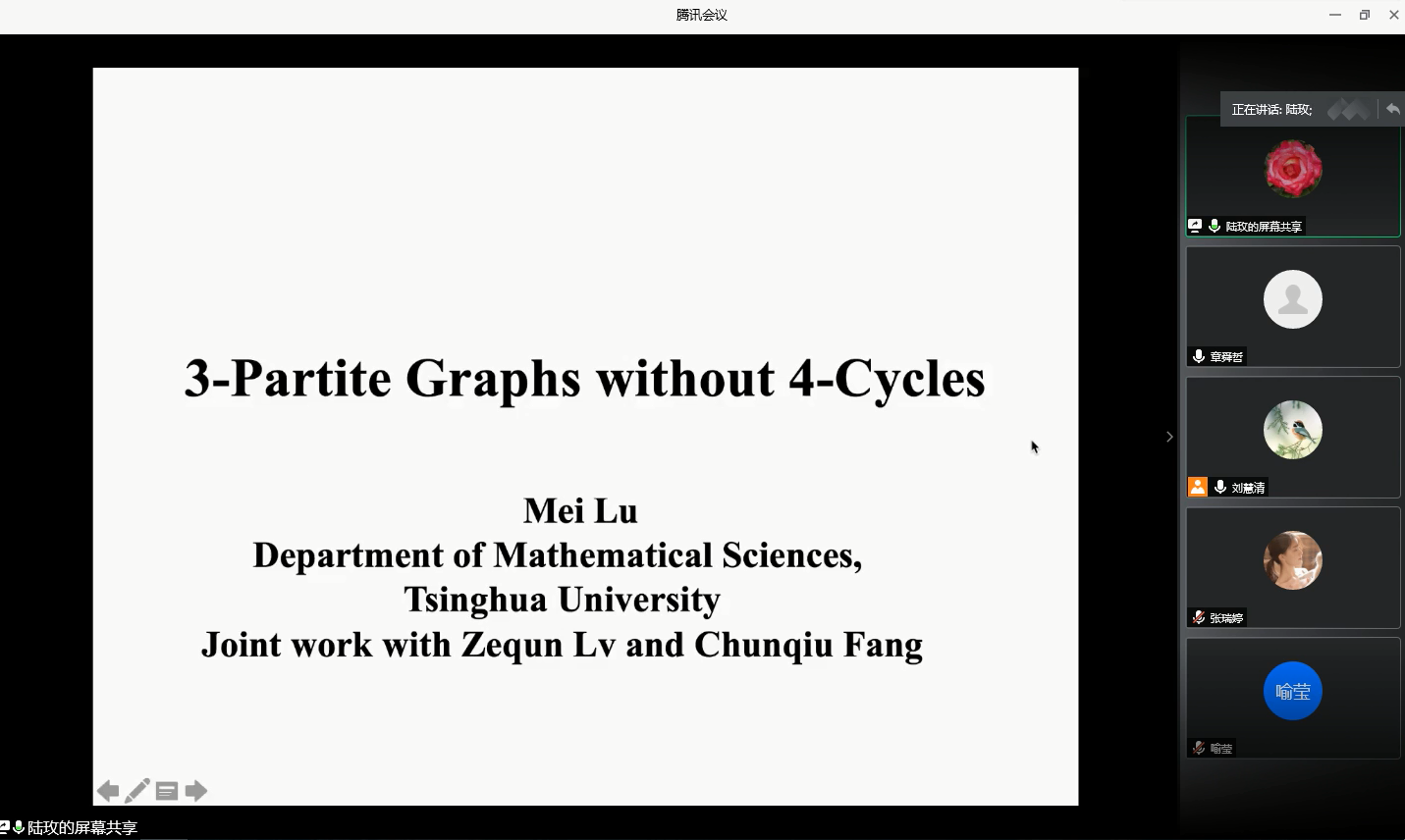 陆玫教授报告题目《3-Partite Graphs without 4-Cycles》,报告介绍了极值图论中的经典问题—Turan数问题,给出了不含4圈的平衡三部图Turan数的一个上界,巧妙地应用数论的方法给出其下界。