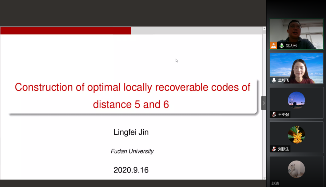 金玲飞副教授的报告题目为《Construction of optimal locally recoverable codes of distance 5 and 6》,本次报告介绍了分布式存储中再生码和局部修复码的研究背景及应用,比较了局部修复码中LRC码与再生码之间的差异性,总结了现有的距离小于5的最优LRC码的构造,给出了运用二元常重码去构造距离为5和6的最优LRC码的具体方法,分析了对于较大距离最优LRC码构造的难点问题。