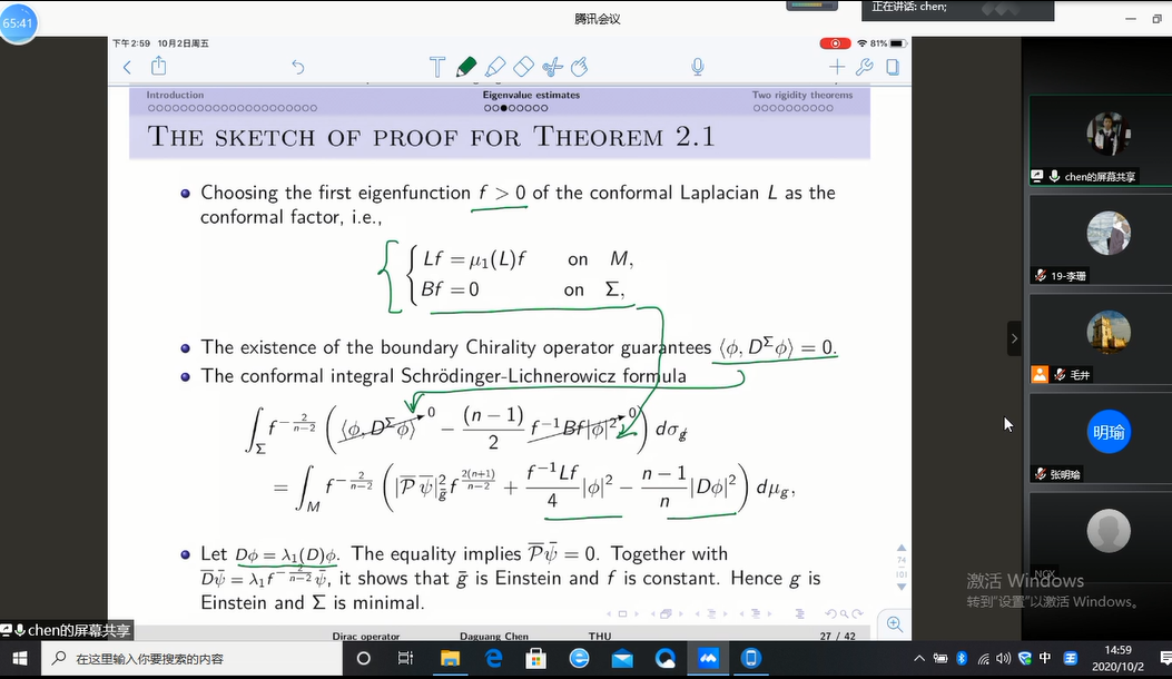 陈大广老师报告的题目为《Eigenvalue Estimates of the Dirac Operator on Manifolds with Boundary and the Rigidity of PE Manifolds》,在这次报告中我们主要讨论了特征值估计及相关刚性问题的内容。陈大广老师首先从四个方面给我们介绍了Dirac算子的相关定义并举出例子;其次,为我们详细讲解了他最近所做带边界流形上Dirac算子的特征值估计与PE流形的刚性问题的主要结论和证明思路;最后,陈大广老师就师生们提出的问题给予了详细的解答。