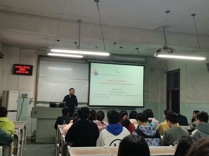 2021年11月25日下午15:30,安徽大学高文武教授应邀在教2-104为公司应用数学及应用统计方向师生作了题为“Quasi-interpolation for high-dimensional function approximation”的学术报告。