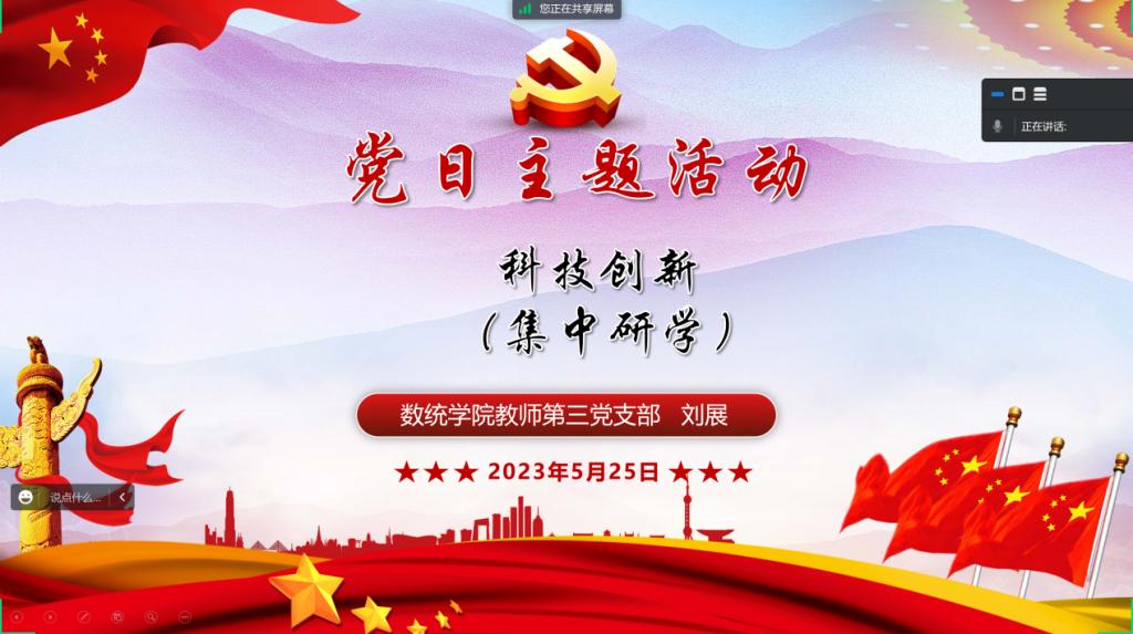 随后,支部全体党员围绕本次研学主题开展热烈讨论。姜峰同志表示:在宏观层面上,面对当前复杂多变的国际形势和实现中华民族伟大复兴的战略布局,科技创新十分紧迫。从自身角度出发,科研和教学、管理等都要有所创新,不能墨守成规。党支部书记刘展同志在总结中指出:第一,结合理论学习,进行探索创新。二十大报告中着重提到“加强基础研究,突出原创,鼓励自由探索”,这与应用统计学科、数学学科的发展和研究紧密相关,希望支部党员在各自熟悉或感兴趣的领域进行自由探索和创新,如在教学领域改革、理论基础方面开展创新研究。第二,结合学科特点,注重成果转化。要积极与企事业单位进行融合,推进数学应用的创新、转化和落地,真正服务地方发展。第三,结合公司、公司实际,全面克难攻坚。真正发挥党员教师的螺丝钉精神,迎难而上,为公司、公司事业高质量发展贡献力量。