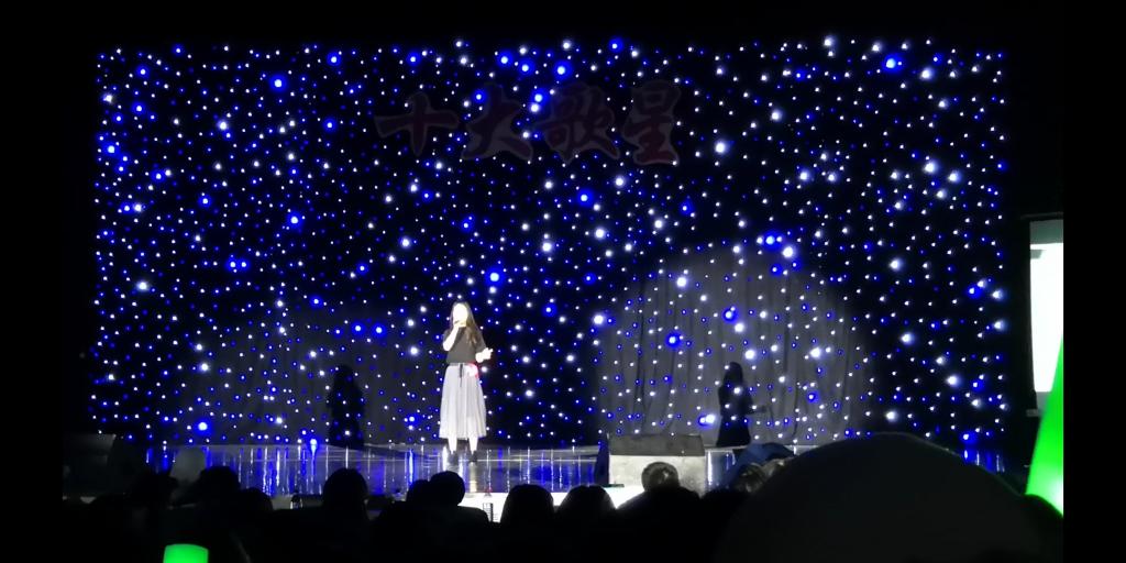 比赛在热情活泼的舞蹈中拉开帷幕,第一环节的小组合唱让观众对各个歌手的声音和风格有了初步的了解。戴慧茹同学和另外三位选手用一曲轻快的《小半》吸引了听众的注意。到了个人独唱环节,各组选手用自己独特的音色,富有感情的歌声证明了自己的实力,既有嘻哈摇滚风格的《Life's a struggle》,也有温柔舒缓的歌曲《月光》。戴慧茹同学演唱的经典歌曲《亲密爱人》配上她低沉的嗓音,仿佛在细细讲述来自上个年代最真挚最甜蜜的爱情故事。十四位选手,十四首不同的歌曲,将现场点燃,掌声欢呼声尖叫声久久不能停息。比赛在歌声中拉下帷幕,最终根据得分选出了十大歌星,戴慧茹同学位列其中。