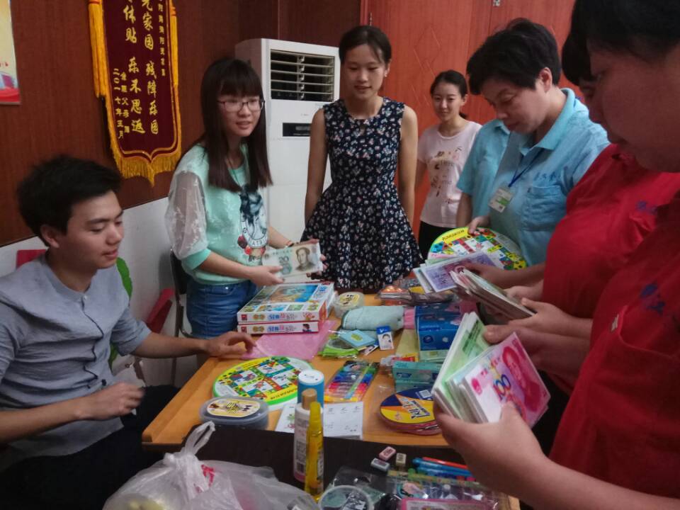 经过端午节的活动后,暖阳服务队仍热情不减,复习了模拟市场,由志愿者黄明华独自担当“售货员”带领服务对象“买”了益智玩具、体育用品、生活用品、文具等各种各样的东西并引导他们自己说出想买的东西和其价格。“小顾客”们都十分聪明,一个个上台成功买到了自己心仪的物品,这意味着他们已经巩固了对人民币买卖的知识。随后大家一起开始了飞行棋、五子棋、拼图、拼装玩具等一系列游戏,最后我们的服务在服务对象依依不舍的目光中结束了活动。