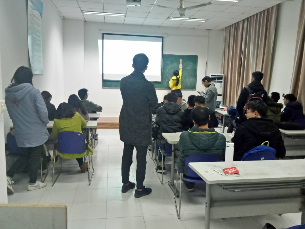 主持人带领同学们就习近平总书记十九大开幕会的讲话开展深入的学习。为加深理解,主持人还播放纪录片《筑梦路上——两弹一星》,同学们看得热泪盈眶,为中国的崛起而感动。随后开展小组竞赛答题环节看同学们到底掌握多少,本次的知识竞赛分党团常识、十九大知识、听歌识曲、及双语学习四个模块,同学们都带着想赢的拼劲,在严格控制答题时间的条件下,认真的思考每一道题。在“双语学习”这个模块里,虽然只有六分钟的时间去记忆12条十九大相关热词及部分主题句的中文和英语形式,但同学们都专心致志的看大屏幕,努力去记忆,挑战自己。最后同学们答题效果都很好,有一组仅错了两个。之后,主持人倡议同学们为十九大写一条宣传标语,至此竞赛活动告一段落。主持人公布积分,为赢的小组分发奖品。随着团歌的结束,本次学习十九大的团日活动也圆满落入了帷幕。