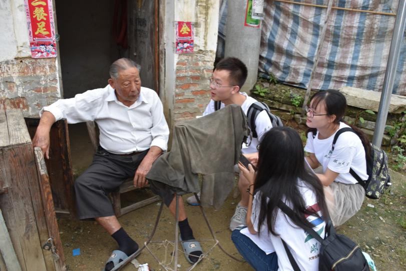 团队成员正在与乘马岗镇老村民进行访谈(摄影戴慧茹)