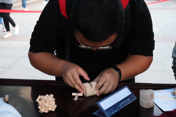 趣味数学游戏包括数字华容道,趣味数独,花样魔方,孔明锁和五子棋等。同学们都积极的参与在活动中。某参赛者说:“游戏很烧脑,需要花很多时间来完成,但这样才更好玩,更刺激,而且游戏失败了还可以领取复活卡更加有竞争力。”镜头里他们认真玩游戏的样子展现了积极向上的精神风貌。