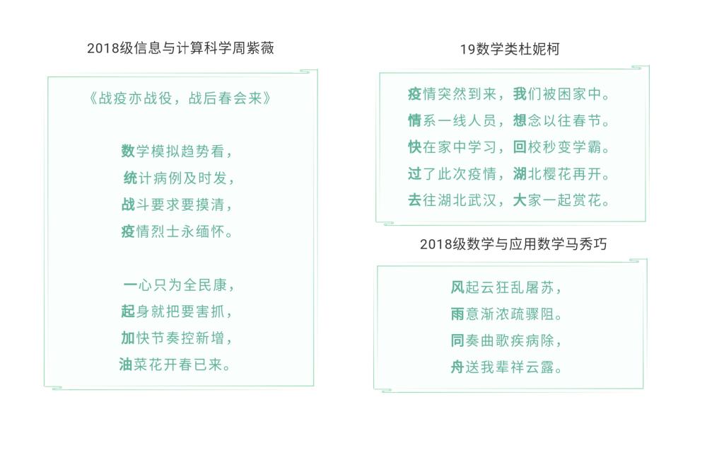 活动刚一发出,就有不少同学积极响应,在短短几天时间,就收到了许多优秀的作品。在经过评审评分以及大众网络投票的综合评定后,最终来自2018级信息与计算科学专业的周紫薇,2019级数学类杜妮柯,2018级数学与应用数学专业的马秀巧分别取得第一、二、三名的好成绩。