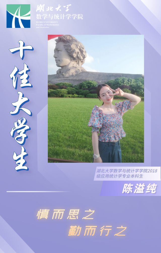 陈溢纯,女,汉族,中共党员,bevictor伟德官网2018级应用统计学专业本科生,公司青马班学员。曾任应用统计学1802团支部团支书、班级学委、公司组织部干事、公司团委副书记等职,入选第24届研究生支教团。