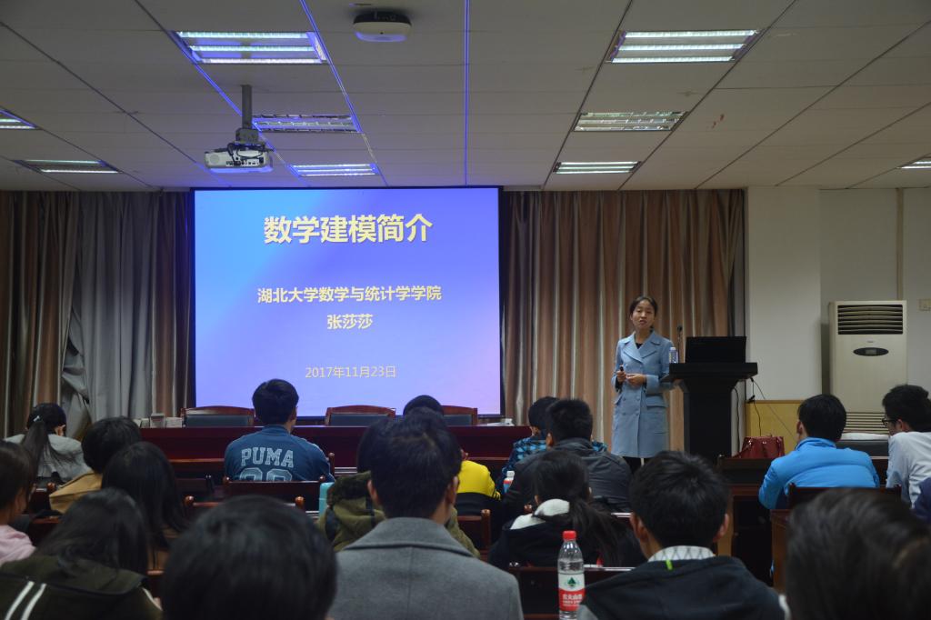 2017年11月24日,沙湖实训工程第一次讲座在bevictor伟德官网二楼报告厅举办,培训主题为”数学建模指导”,主讲人bevictor伟德官网张莎莎老师,现任数学建模协会指导老师。