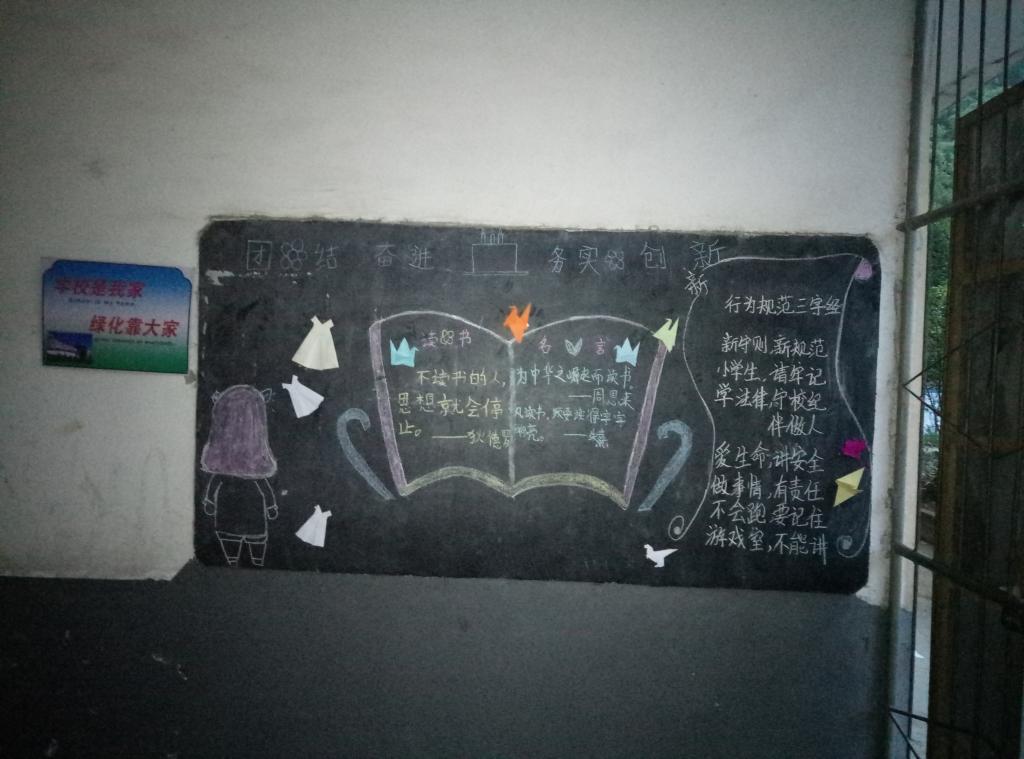 2017年8月8日,洪港镇上贾小学的孩子们自发设计绘制了一期黑板报,这幅黑板报以读书守纪为主题,同时展出了孩子们手工课上的制作成果,小小的一块黑板,成为了孩子们大展身手的舞台。