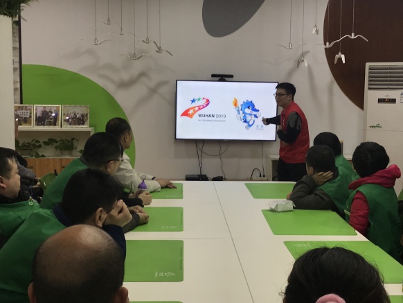 活动开始前,主讲人通过一段三分二十秒的武汉军运会宣传片以吸引服务对象的注意力,并对军运会中的运动项目做了介绍。接下来,志愿者介绍第7届世界军人运动会,并对服务对象进行提问,提问时反响热烈,志愿者和服务对象们互动积极性较高。然后,服务对象对卡通军人进行模仿绘画为武汉军运会的活动加油助威。结束后志愿者与服务对象们进行了合影留念。